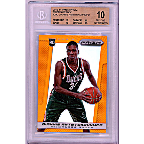 Already an NBA champion and two-time league MVP, Giannis Antetokounmpo continues to polish his hall of fame resume with each passing season. This Orange Prizm rookie card with a print run of 60 received a “Pristine” 10 grade from Beckett.