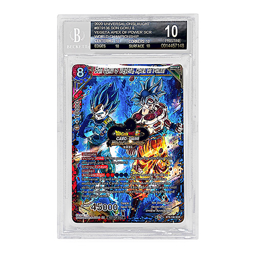 A highly limited set, given only to the 2021 World Championship competitors and hosts, each card features a special Dragon Ball Super stamp and has achieved the highest grade in the hobby – BGS Pristine 10 Black Label.