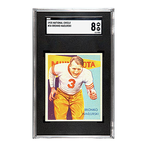 Football collecting’s answer to baseball’s T206 Honus Wagner – the 1935 National Chicle Bronko Nagurski. Fewer than 225 examples have been graded by PSA, SGC, and BVG of this colorful pillar of football collecting. Graded an SGC 8.