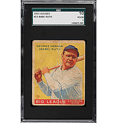 The 1933 Goudey features some of the most sought after cards of the era, and this Babe Ruth is no exception. A great piece of hobby and baseball history despite its SGC 1 grade.
