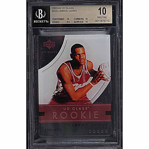 A unique and short printed LeBron James rookie card numbered to 250 in BGS 10 pristine condition. There were three tiers of rookies in the 2003 UD Glass set, and naturally, LeBron’s card fell into the scarcest group. In BGS 10 Pristine condition, this card is part of a population of 16.