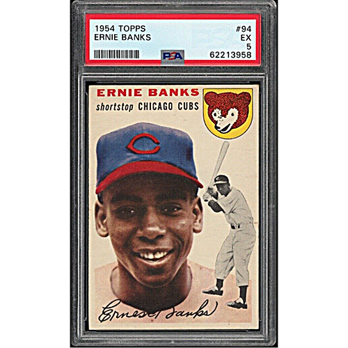 The 1954 Topps checklist introduced two huge Hall of Fame rookie cards. Ernie Banks is one of them. “Mr. Cub” won back-to-back MVPs in 1958-1959 and belted over 500 career home runs.