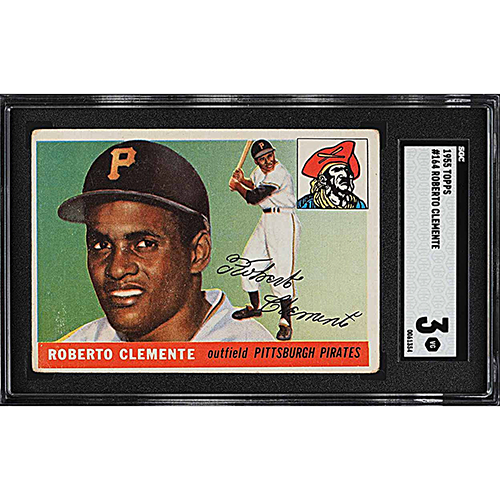 Another key rookie from the 1955 Topps set, the Roberto Clemente is a vintage classic. Hall of Famer and member of the 3,000-hit club, Clemente was one of the best outfielders of the era. Collectable is home to a PSA 8 graded copy.