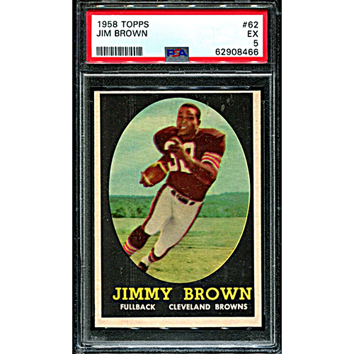 The title of most iconic football card of the 50s decade belongs to this 1958 Topps Jim Brown rookie. The card features a beautiful action shot of the Cleveland Browns Hall of Fame fullback. Brown won league MVP 4 times in his 9-year career.