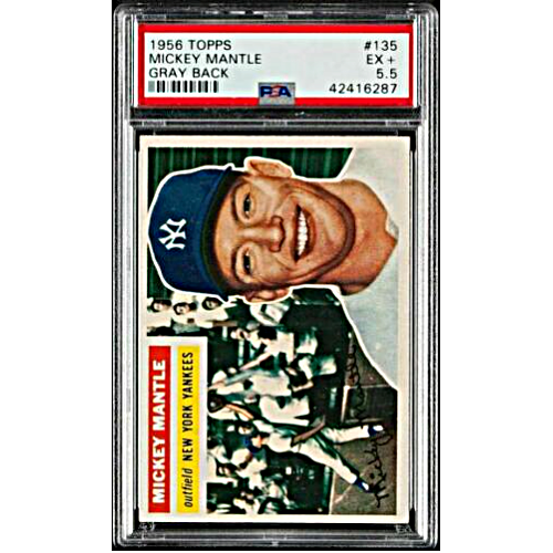 Another early career Mickey Mantle Topps issue, the 1956 features both a portrait and action shot. There is currently a basket of (2) PSA 8s trading on Collectable.