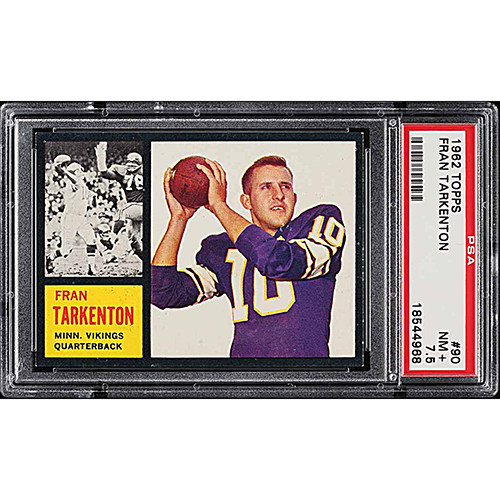 The most popular rookie card of Vikings Hall of Fame quarterback Fran Tarkenton. The 1962 Topps set featured black boarders, making it one of the most difficult sets of the era to collect in a high condition. This PSA 7.5 received the PWCC “Above Average” eye appeal rating, and boasts far less edge chipping than the average copy.