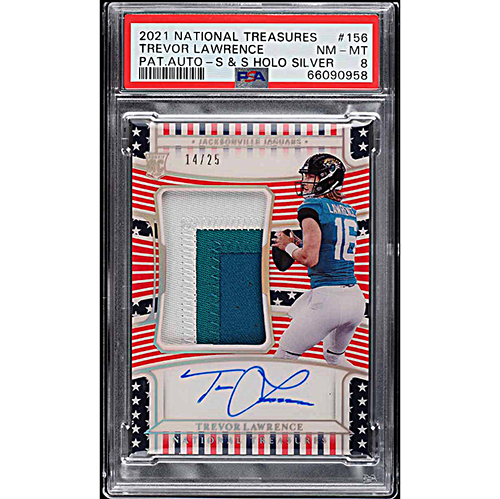 2021 National Treasures Stars & Stripes Trevor Lawrence Rookie Patch Autograph /25 PSA 8