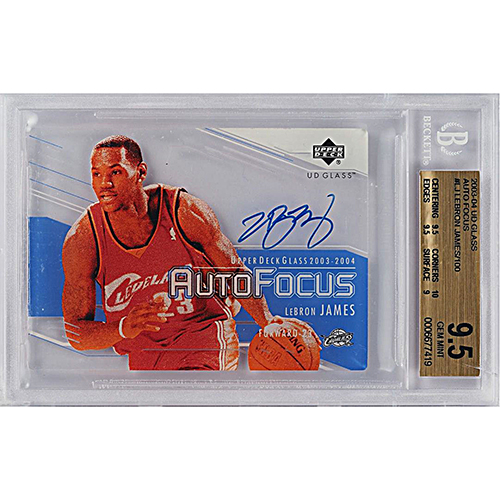 A rarely seen LeBron James acetate rookie autographed card limited to 100 copies. Hailing from the 2003-04 UD Glass set, this card features an on-card signature of “King James” from his rookie season with the Cavaliers. Acetate cards like this are known for being hard to grade, making this BGS 9.5 all the more special.